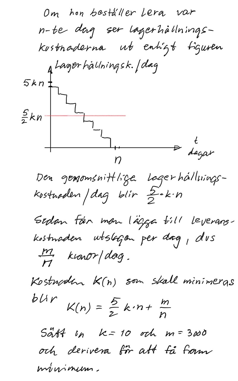 - En lagerhållningskostnad på k kr/dag för varje enhet lera som finns i lagret.