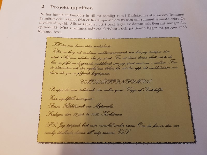 Jag har fått i uppgift att dekryptera den texten i mitten men har ingen anning om hur jag ska göra. Har testa vigenär med mängder med nyklar från texten men får inte ut något.