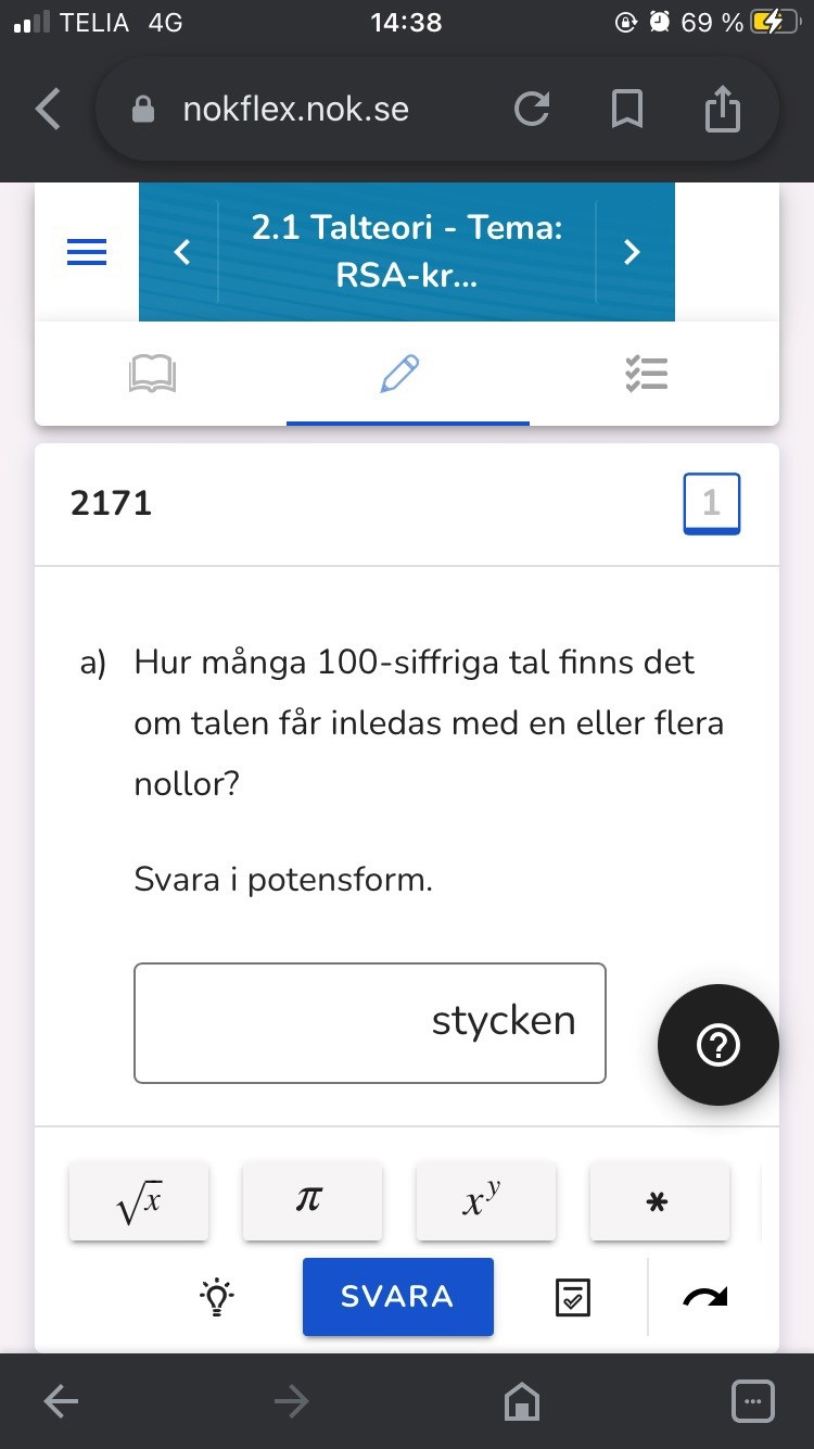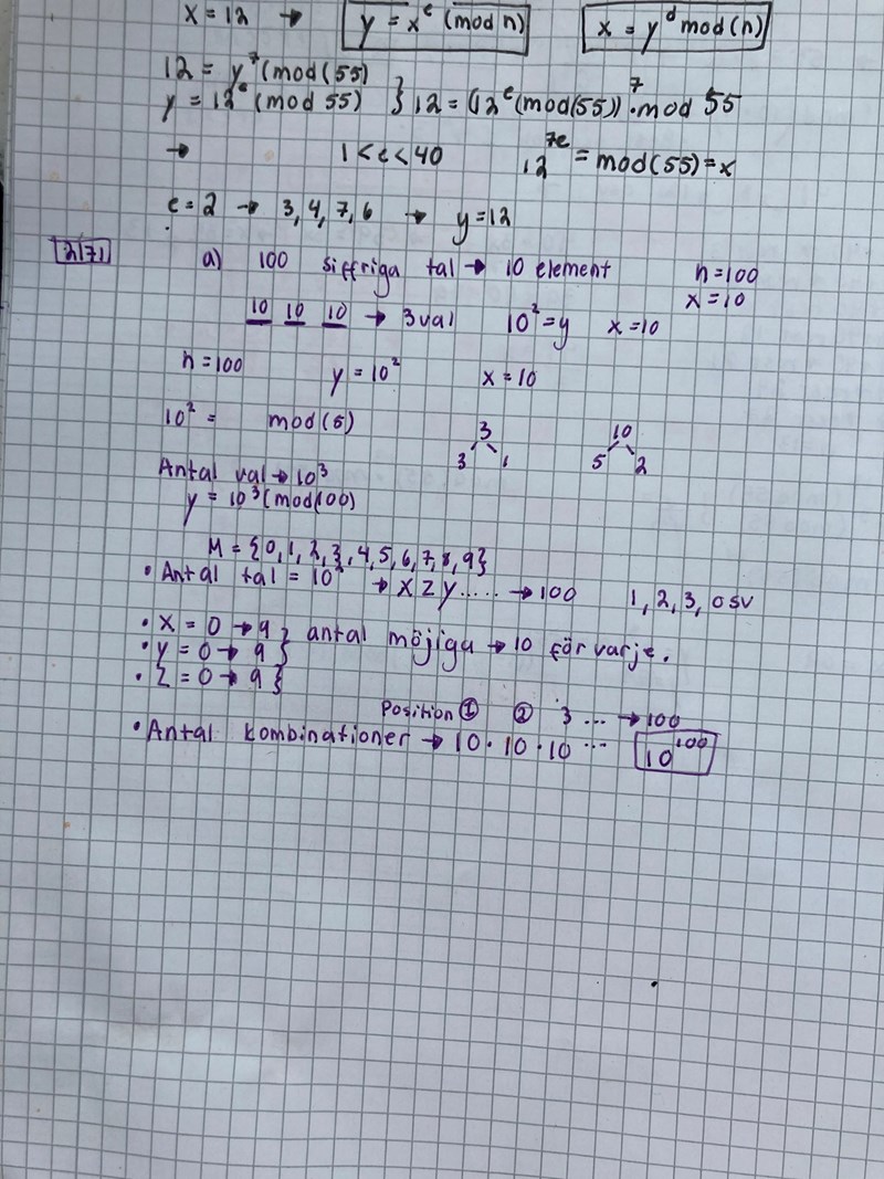 Hej! Jag sitter fast på en uppgift som jag inte vet hur jag ska komma vidare med. Hur identifierar jag vad som är x, n, e och d enligt RSA kryptering? Utifrån modulo beräkning tänkte jag mig att mängden utgörs av talen 0-9 i och med att att 0 är tillåtet. Samt att antal val är 10^2 dvs 100 st. Men hur kommer jag vidare nu och hur kopplas detta till kryptering?