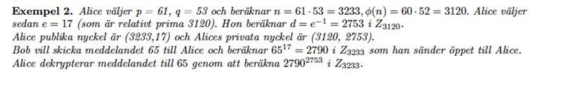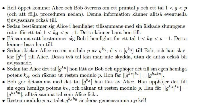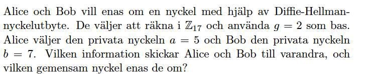 * Alice skickar resten modulo 17 av 252^5 till Bob, och han skickar resten modulo 17 av 272^7 till Alice. Alice skickar alltså 15 och Bob skickar 9.
