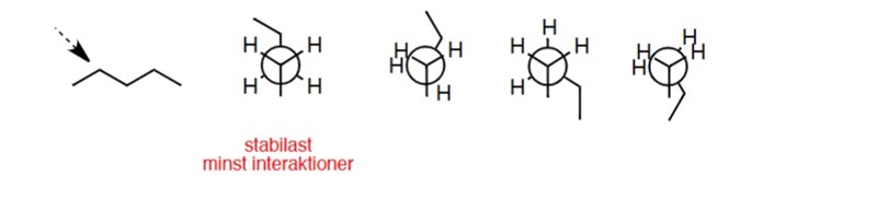 "Titta längs med C2-C3 bindningen hos pentan. Det finns två olika kryssformeroch två olika ekliptiska former. Rita dessa och markera den stabilastekonformationen samt förklara varför den är stabilast."