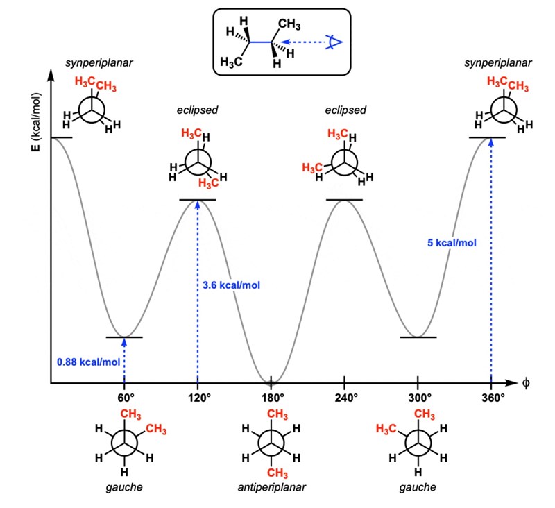 Bilden nedan illustrerar konformationens energin i förhållande till rotationsvinkeln - och där blir det nog tydligare att samtliga lokala energi minima/maxima nås redan inom en halv rotation.