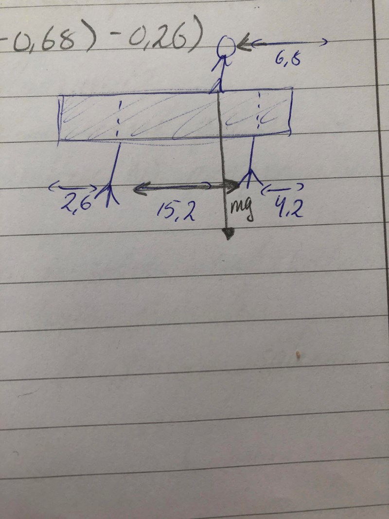masscentrum för balken är väl i mitten alltså (2.6+15.2+4.2) och för mannen är väl där han står eller?