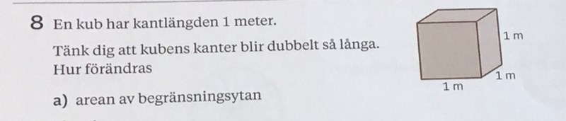 Du behöver beräkna begränsningsytan för kuben (totala arean) då sidan är 1m resp 2m.