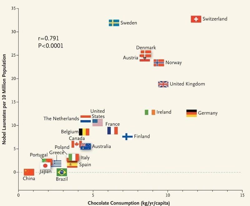 Ät mer choklad och vinn Nobelpriset! Eller finns det någon som kan klura ut vad som troligen är det sanna sambandet här? Jag har min egen teori.
