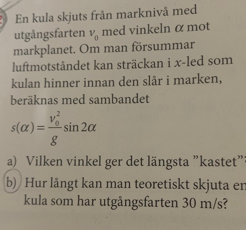 Skulle behöva hjälp med hela uppgiften. Antar att man först ska ta reda på derivatan. Men fattar inte vad vinkeln ska vara