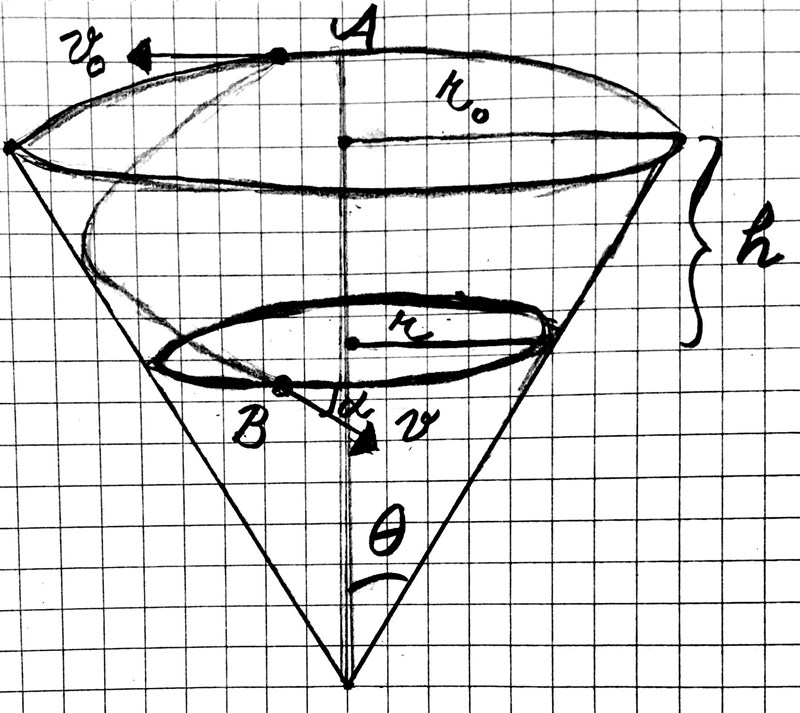 En kula med massa ges en begynnelsehastighet som tangent till den horisontella kanten av en jämn kon i punkten A med radie . Konens halva öppningsvinkel är . Senare befinner sig kulan på ett avstånd under konens kant och ett avstånd från den vertikala mittlinjen. Dess hastighet bildar en vinkel med den horisontella tangenten till konen genom en punkt B. Kulan rör sig friktionsfritt.