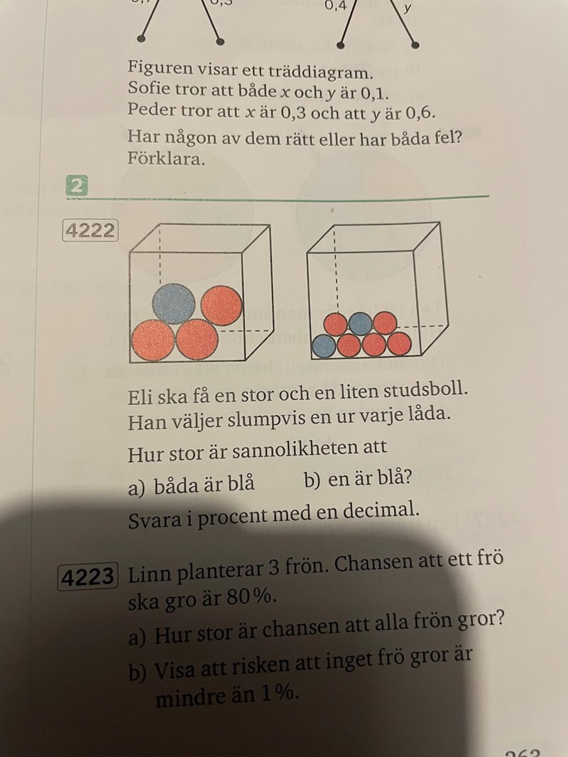 Men, ja, jag åker dit på läsförståelsen igen ser jag. Fick inte ihop det för att jag inte kunde förstå frågan ordentligt. Om båda är blå så är ju också en av dem blå, den andra kulans färg är ju irrelevant. Frågan borde ju fråga om sannolikheten för att en av dem är blå och den andra röd, som jag tänker.
