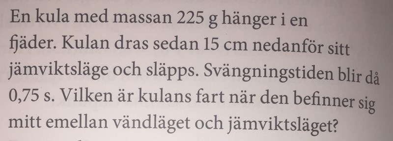 v=wAcos(wt)där w=2πT=2πo,75=8,4 rad/s och A=0,15 munder en hel svänging når kulan positionen emellan vändläget och jämviktläget 4 gånger, därav blir tiden 0,75/4=0,1875 sv=8,4*0,15*cos(8,4*0,1875)=-0,005 m/s