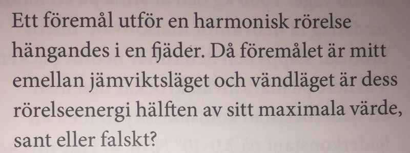 Varför är det falskt? Rörelseenergin är maximal i jämviktsläget, den minskar när föremålet rör sig mot vändläget eftersom lägesenergin ökar. Borde inte rörelseenergin vara hälften av det maximala i läget mitt emellan vänd- och jämviktsläget?