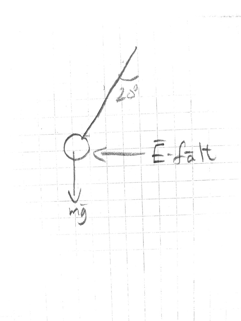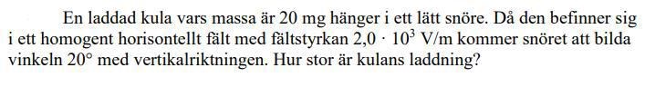 Då har du (om du flyttar om vektorpilarna lite) en rätvinklig triangel med kateterna mg respektive Eq. Vilken trigonometrisk funktion kan du ha nytta av i det här fallet?