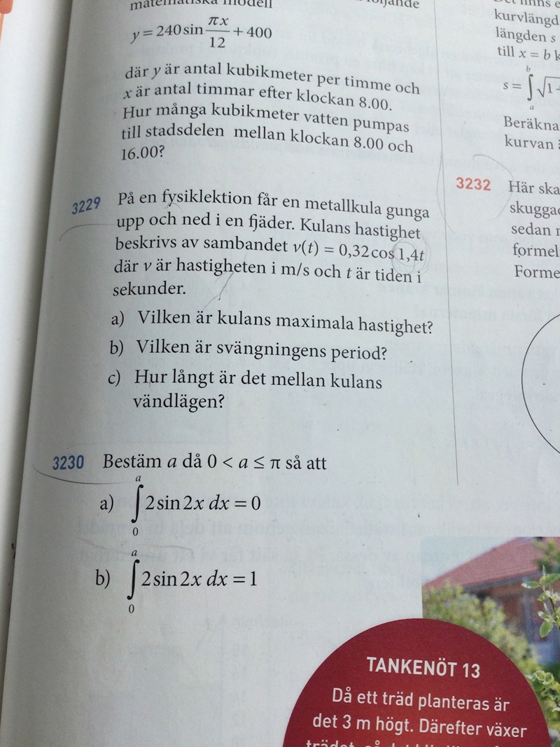 3229c) man ska bestämma sträckan mellan vändlägena. Jag räknade ut perioden som blev 4,5 sekunder. Jag vet att man ska ta integralen av funktionen för att ta reda på sträckan men jag är inte säker på om perioden är lika med tiden mellan vändlägena? Alltså jag tänker att perioden visar på att efter 4,5 sekunder så är kulan tillbaka till sin ursprungliga position. Om jag vill bestämma sträckan mellan vändlägena är integrationsgränserna mellan 0 och 2,25 sekunder.