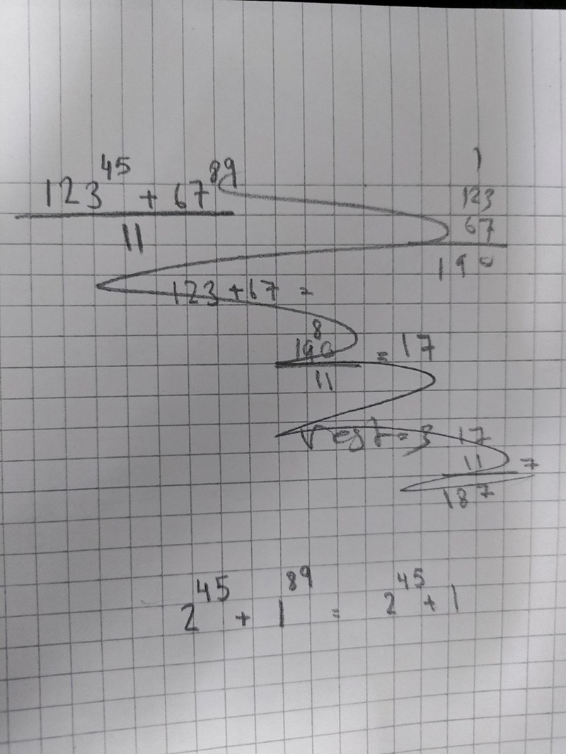 Man ska bestäma resten då 123^45 + 67^89 devideras med 11. Hur går jg vidare?
