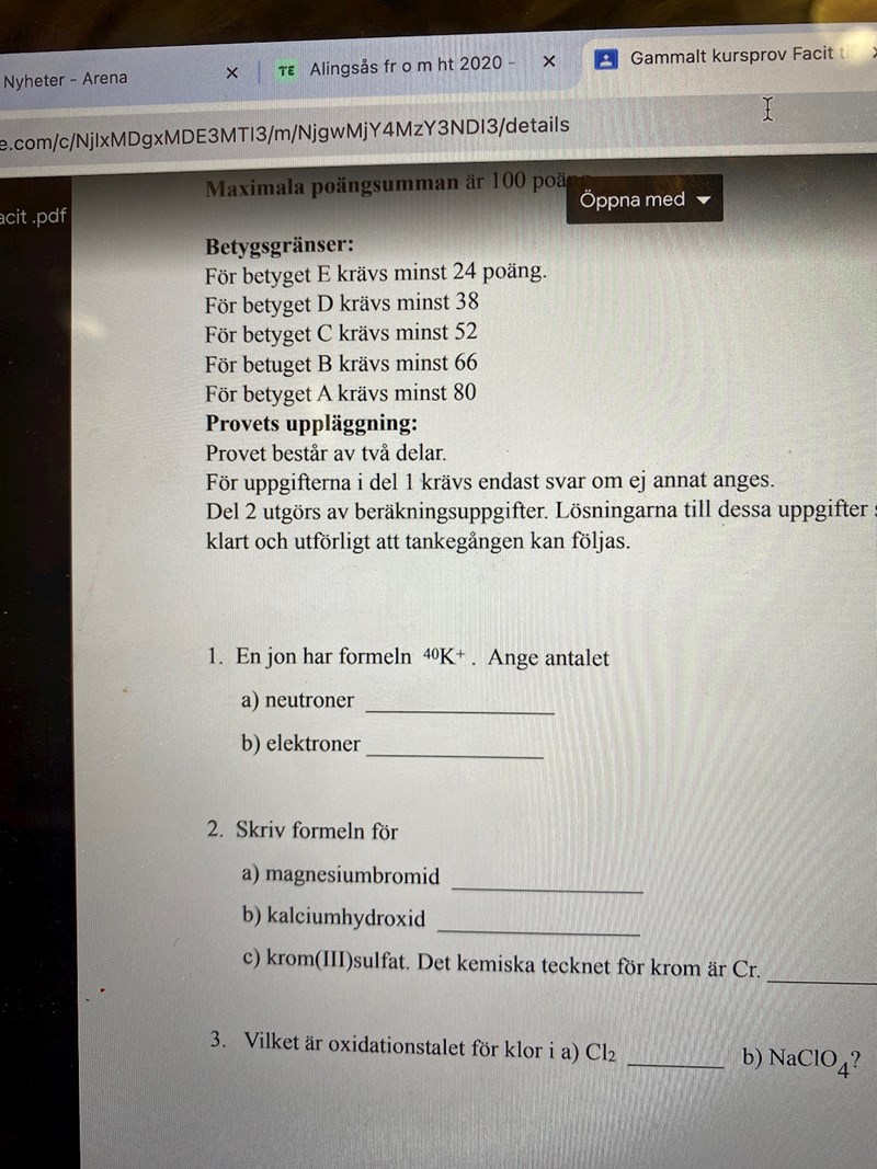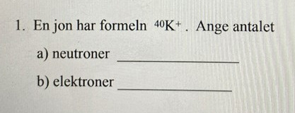 Titta i periodiska systemet! Hur många protoner finns det i en kaliumkärna? Antalet neutroner är 40 minus detta antal. En kaliumatom har lika många elektroner som protoner. Hur skiljer sig antalet elektroner mellan en kaliumjon och en kaliumatom?