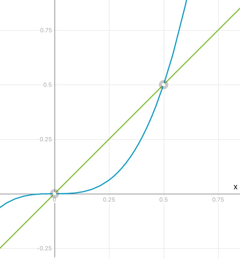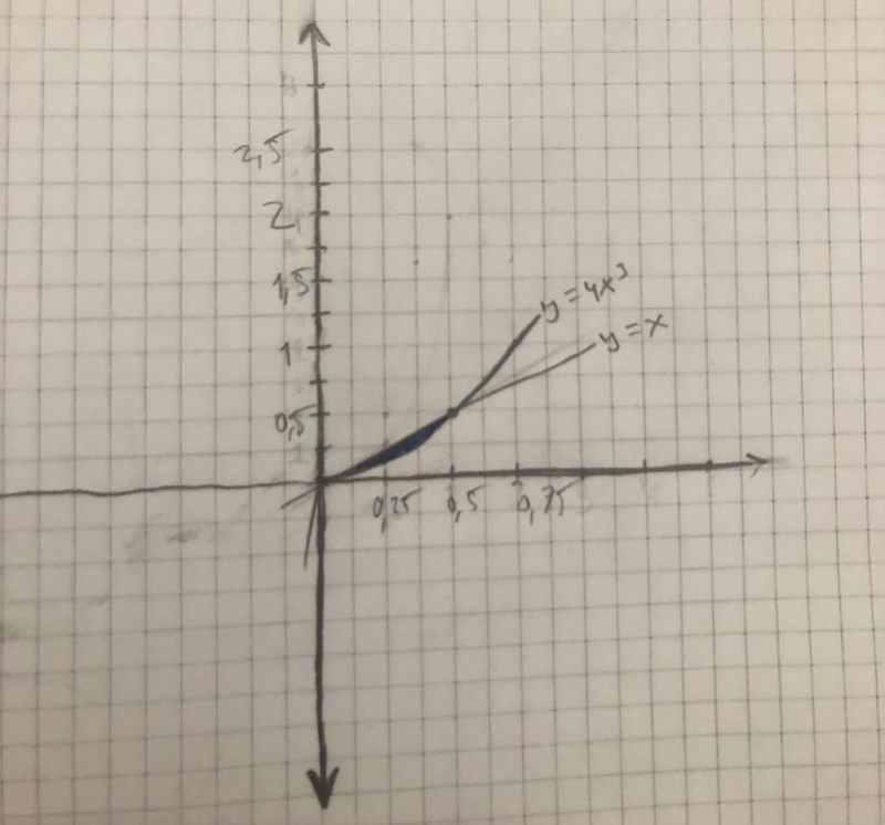 Om vi utgår ifrån att graferna ska se ut så här : ska jag ta den övre funktionen - undre funktionen” x”? Inom x intervallet x=0 till x=1/2