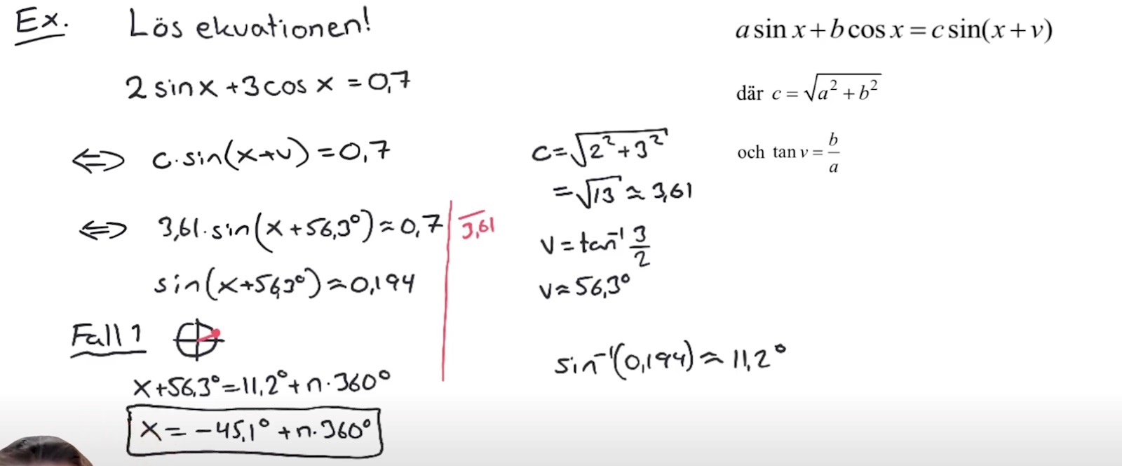 Vad x:er står för i slutändan är vilka vinklar som uppfyller den ursprungliga ekvationen. Summan av 2 multiplicerat med sinusvärdet för någon vinkel x och 3 * cosinusvärdet för samma vinkel x ska bli 0,7.
