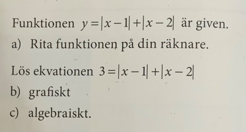 Det verkar vara layouten som förvillar dig. Du kan använde det mesta du redan gjort, men hela uttrycket för y måste med. Notera först att för x<1 är x-1 negativt så att abs(x-1) =1-x och abs(x-2) =2-x  Ekvationen blir då 3= 1-x + 2-x som du löser. Sedan