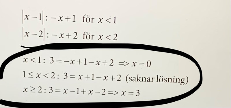Innan man löst ekvationen vet man inte var lösningarna finns. Man måste därför kolla alla möjligheter. Du har rätt när du skriver "saknar lösning" i näst sista raden. Om den hade haft någon så skulle ju den vara 0, men noll tillhör ju inte det aktuella intervallet. 0 dyker däremot upp som lösning i intervallet x<1.