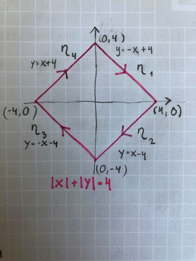 Min första tanke var att eftersom vi har ett slutet område så kan Greens sats användas på en gång. Men då fick jag ett väldigt krångligt uttryck och tänkte därför att man kanske skulle dela upp kurvan i 4 delar och att de tillsammans bildar den sökta integralen.