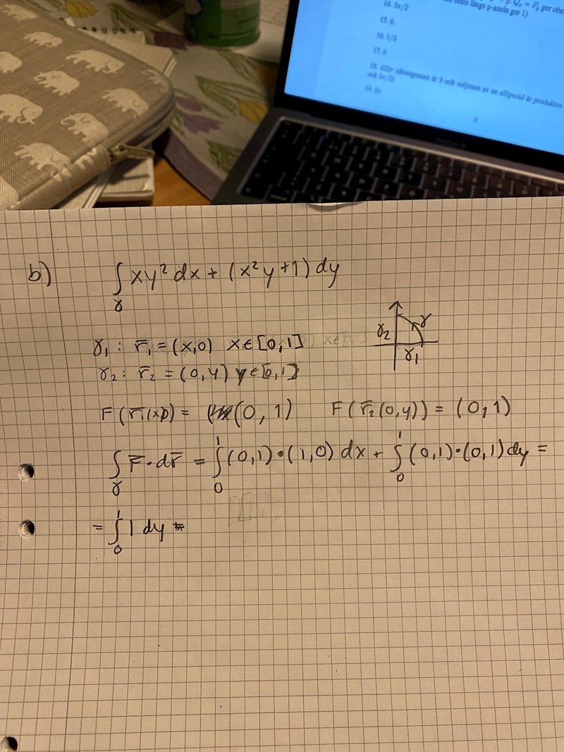 Här gör vi enbart en vanlig kurvintegral mellan 2 punkter. Positiv riktning definieras av problemformuleringen. I detta fall löper kurvan från (1,0) till (0,0) (negativ x-riktning) och sedan från (0,0) till (0,1) (positiv y-riktning).
