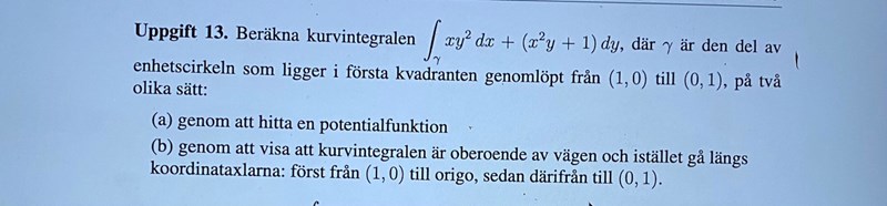 Calle_K skrev:I x-riktningen går den i negativ riktning, men integranden till denna blir ju 0 ändå så det har ingen påverkan. Jag gissar att du i a) uppgiften kan se att potentialen är konstant på y=0, därmed kommer kurvintegralen inte ge något bidrag då vi förflyttar oss på linjen y=0.