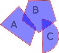 Det innebär område C i figuren nedan, och randen till området är den röda linjen som går runt hela område C. Du hade förmodligen accepterat randkurvan som innesluter A utan problem, liksom B. Det är egentligen ingen skillnad, randen till området ska innesluta området.
