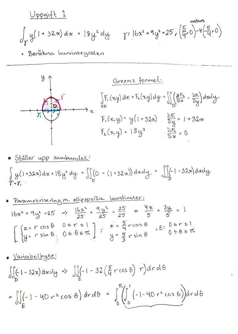Min metod är att använda Greens formel, där jag då sluter halvelipsen som bildar med en till kurva som går tillbaka längs x-axeln. Jag drar sedan bort . Använder jag fel metod för denna typen av beräkning? Vilken ska jag i så fall använda istället?