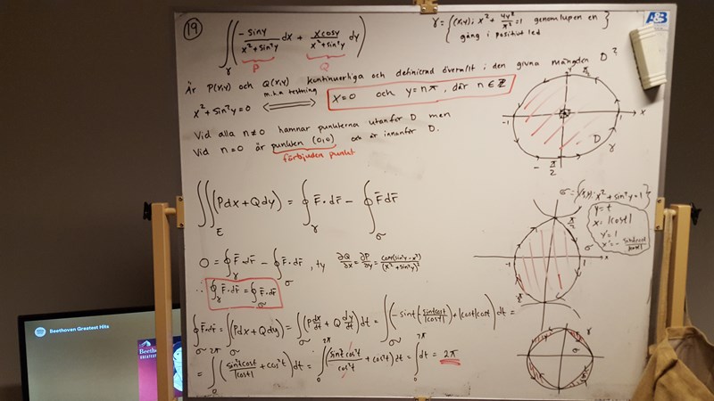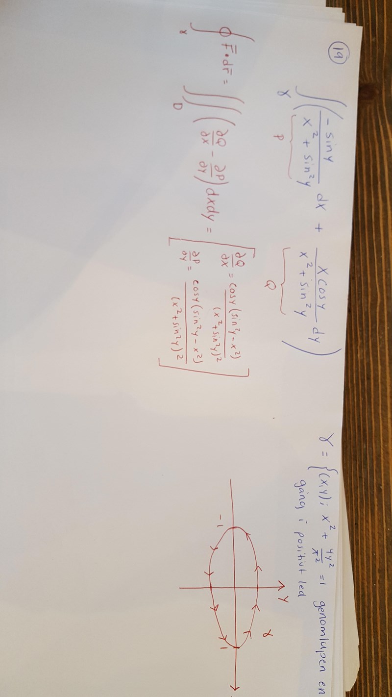 Det rör sig om uppgift 19. Trodde först att jag kunde använda Greens formel då kurvan är sluten. Men svaret är inte noll enligt facit. Är helt ny på detta område så all vägledning uppskattas. Tack!