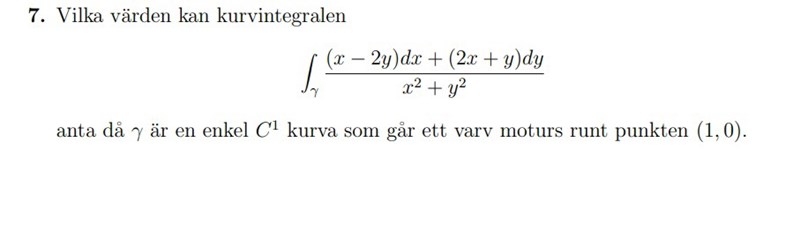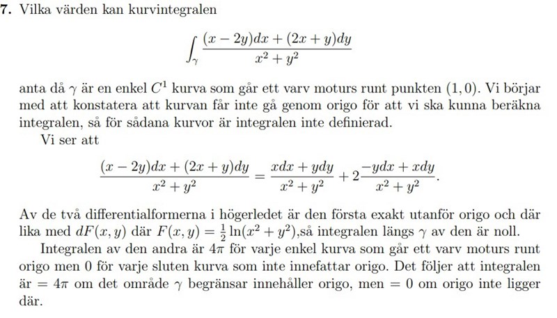 Räknade ut att den första blev 0 överallt där den är definerad. Den andra tyckte jag var klurigare. Kunde få fram att om jag låter gamma omsluta origo så är integralen 4pi. Enligt lösningsförslaget är den 0 om man inte omsluter origo, men jag kan inte komma på ett bra sätt att räkna ut det när gamma måste vara en kontinuerligt deriverbar funktion. Försökte först sätta x = 1 + rcos(v), y = rsin(v) men blev väldigt krångligt.