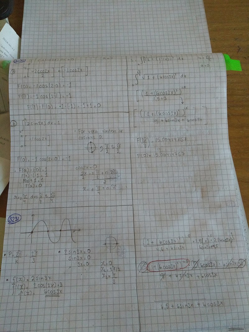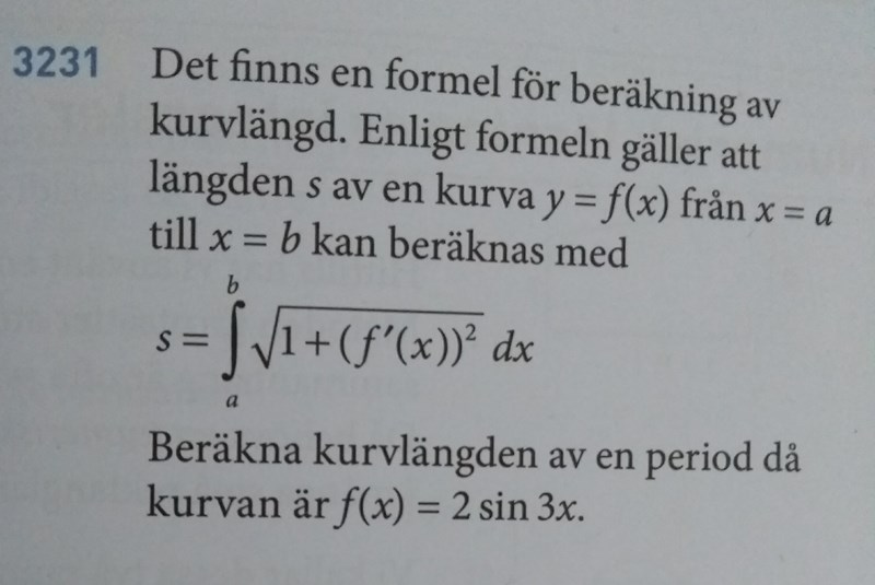 Om jag har förstått frågan rätt så skulle man först beräkna perioden, hitta funktionens nollställen och derivera uttrycket. Sedan skulle jag sätta in f'(x) i formeln för kurvlängd, hitta integrationsgränserna och därefter integrera. Jag misstänker att det är min primitiva funktion det är fel på men jag har hittills inte lyckats hitta felet. Längre ner på bilden finns mina tankegångar kring den primitiva funktionen.