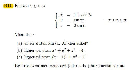 Det kan du göra för att få en överblick, men uppgiften vill nog att du visar det algebraiskt. Att kurvan är sluten kan du visa genom att stoppa in start- och slutvärdena ( och ) och visa att -, - och -värdena blir samma.