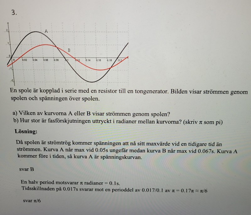 Facit säger att max för röda (B) vid 0.067s och 0.05s för svarta (B). Man kan också titta vid nollgenomgången, det är lite tydligare att se skillnaden där. Dvs den röda kurvan är ungefär 0.017s efter den svarta.