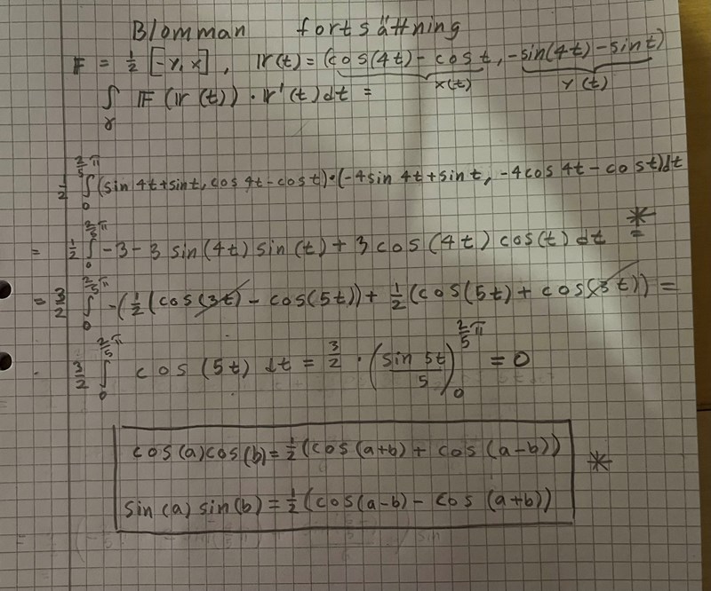 Hej! Jag läste det andra inlägget och där beräknade man en vanlig kurvintegral med fältet F = 1/2(-y,x) från Greens formel. Fast då förstår jag inte riktigt om cos(4t)-cos(t) i parametriseringen ska ersätta y i F, eftersom de står på "samma plats" i respektive vektor, eller x i F, eftersom cos(4t)-cos(t) representerar x-koordinaten för kurvan?