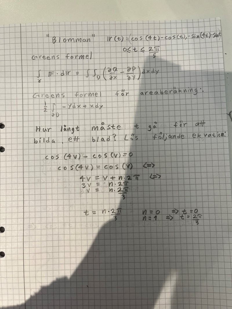 Men för att använda den måste jag känna till gränserna för t. Jag tänkte att jag måste ta reda på hur långt t måste "gå" för att kurvan ska komma tillbaka till origo en gång, och därmed få ett blad. Därför löste jag följande ekvation: