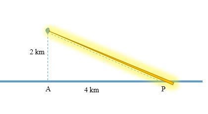 "På en liten ö som befinner sig utanför en rak kuststräcka finns en fyr vars ljuskägla roterar med hastigheten 3,0 varv/min. Det kortaste avståndet mellan fyrtornet och kusten är 2,0 km. Denna punkt på kustlinjen döps till A. Vid ett visst tillfälle befinner sig en person P vid kusten på ett avstånd som är 4,0 km ifrån A. Hur snabbt passeras personen av ljuskäglan?"