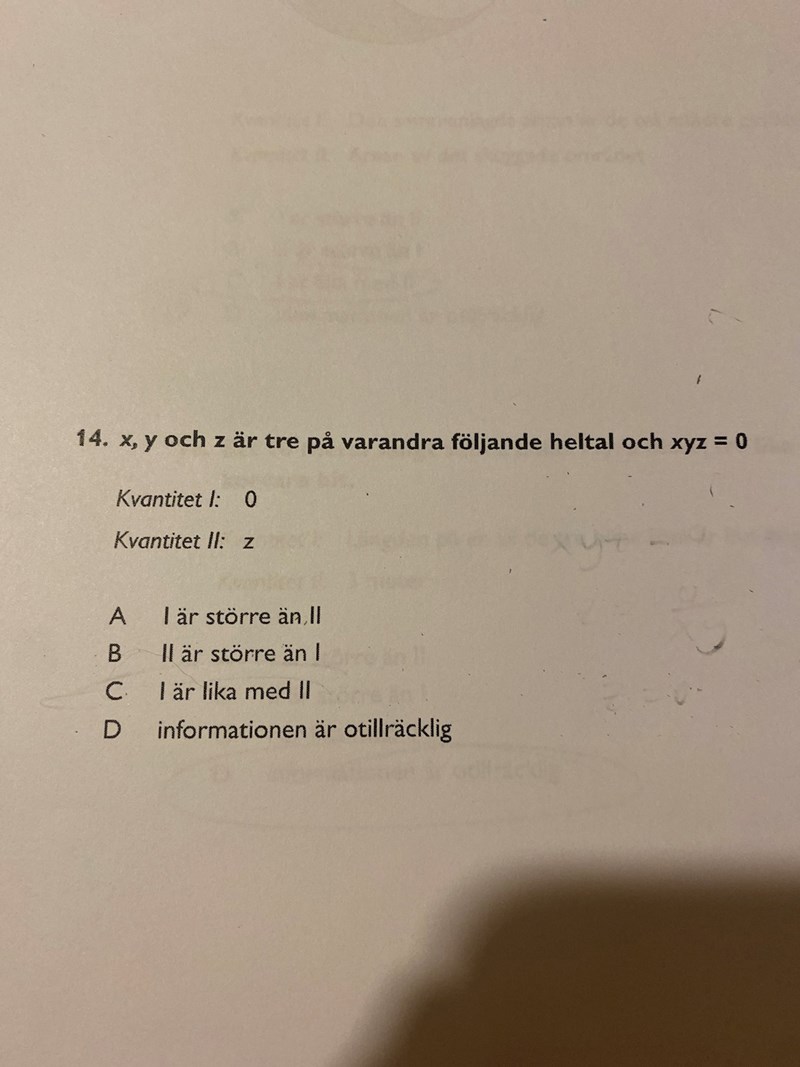 x=0, y=1, z=2Eftersom du inte vet vilken lösning som gäller är svaret D.
