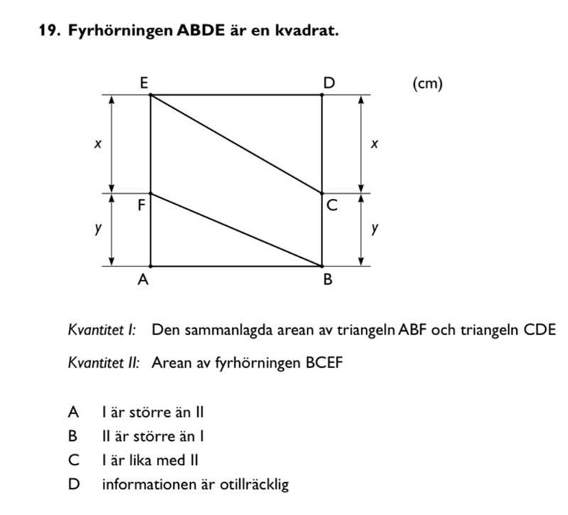 Hej! Finns det något snabbare/enklare sätt att lösa denna uppgiften än att beräkna trianglarnas areor i algebraiska uttryck och sedan sedan i (2) ta fyrhörningens area subtraherat med trianglarnas, för det tar extra tid tycker jag.