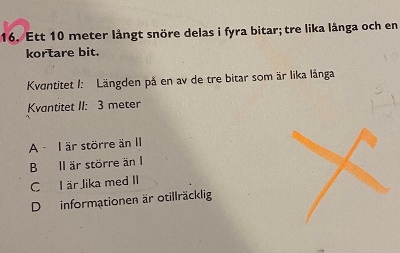 MathematicsDEF skrev:Jag antar att längderna bara är heltal, 10/4 blir ju 2,5, men 3 av dessa 4 bitar ska vara lika långa så om de 3 bitarna har längden 3 meter istället så blir det ju 3,3,3 vilket tillsammans blir 9, då måste ju den 4:e och sista biten ha längen 1 meter (den sista biten måste vara kortare än de 3 andra). Så kvantitet I blir ju då 3 meter, och kvantitet II säger ju 3 meter.
