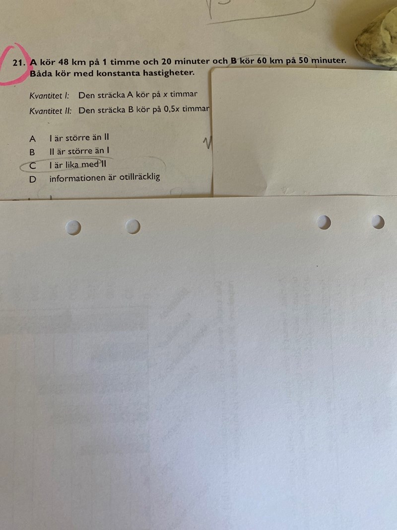 Jag tänkte göra om respektive tid till bråktal så att A kör 48 km på 4/3 h och B kör 60 km på 5/6 h och sedan tar jag reda på vad A kör på 1 h vilket blir 48/(4/3)=36 km och B kör 60/(5/6)= 72 km på 1h. Sedan kan jag räkna ut att (1) blir 36 km och (2) blir hälften av 72= 36 km. Men jag tycker detta sättet tog lite lång tid, finns det något annat som jag kanske missat?