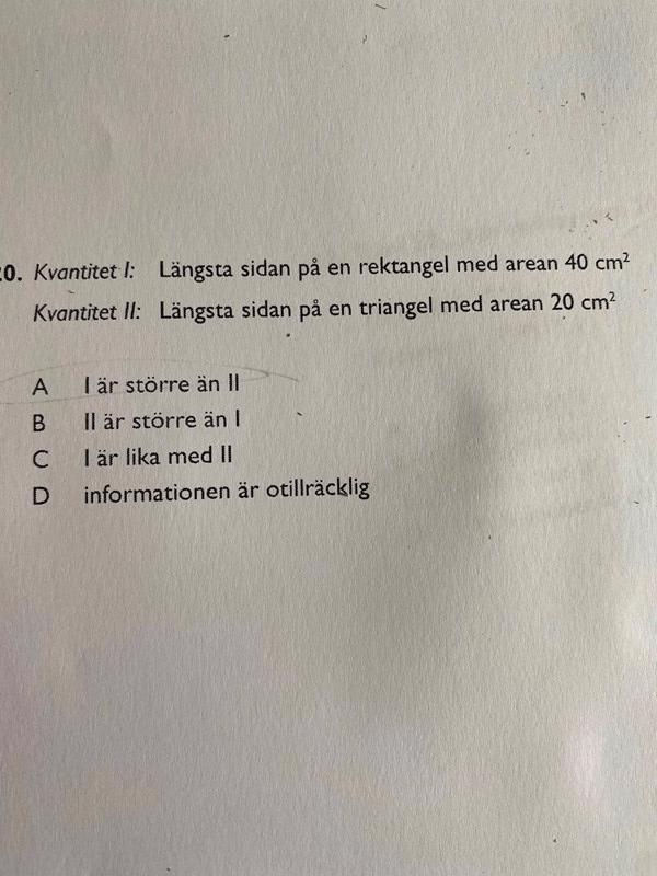 Hej! Jag blev fundersam över varför svaret är D. Men anar att det är för att triangelns längsta sida är alltid hypotenusan och det värdet kan vi inte komma åt mha formeln för triangelns area? Är det därför informationen anses vara otillräcklig?