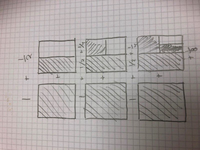 Jag försöker illustrera detta med bilden nedan. Det nya som läggs till är ju hälften så stort som föregående. Jag kan alltså dela upp det som är kvar i all oändlighet utan att riktigt fylla tomrummet som är kvar. Det är visserligen ett typiskt gränsvärde där parentesuttrycket går mot 1 när serien går mot oändligheten.