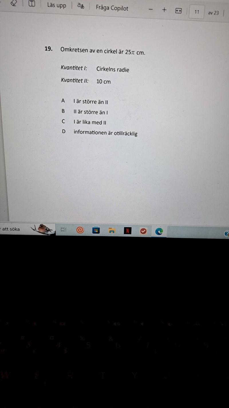 Judit skrev:Radien är, precis som du säger, 25/2 vilket är 12,5 cm. Det är mer än 10 cm, alltså är cirkelns radie (kvantitet I) större än 10 cm (kvantitet II). Därmed är A rätt.