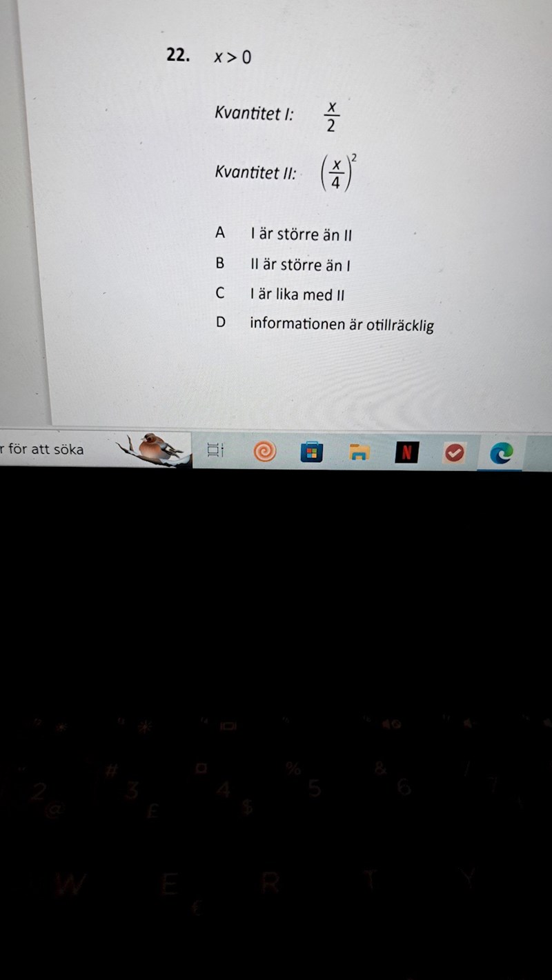 Om man testar att sätta in x=1 så ser man hur I > II. Men facit säger D. Hur ska man tänka här?
