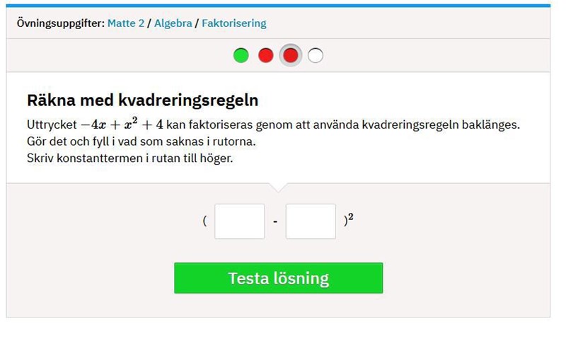 Så genom att hitta det gemensamma mellan termerna i uttrycket och faktorisera det gemensamma jag hittade så lyckades jag få svaret (x - 2)^2.