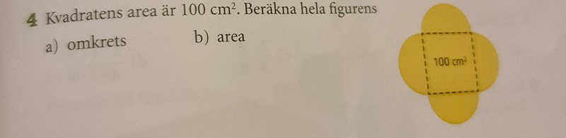 I uppgiften får du reda på att arean är 100cm^2. Enkel huvudräkning ger dig ju då att en sida på kvadraten är 10cm. Enligt figuren är halvcirklarnas diameter den samma som kvadratens sida, dvs 10cm. Figurens omkrets utgörs av 4 halvcirklar, alltså omkretsen av 4 cirklar med diametern 10, dividerat med 2, eller 2 hela cirklar ( sak samma )