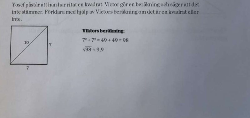 Om det hade varit en perfekt kvadrat med sidorna 7 skulle diagonalen ha varit exakt roten ur 98. Men roten ur 98 är inte 10. Så det är inte en perfekt kvadrat.