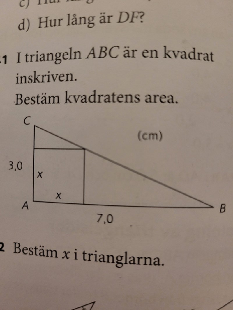 I triangeln ABC är en kvadrat inskriven. Bestäm kvadratens area.