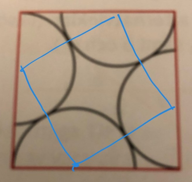 Frågan är: Fyra halvcirklar med radien 2 är inritade i den röda kvadraten. Vilken är kvadratens area?