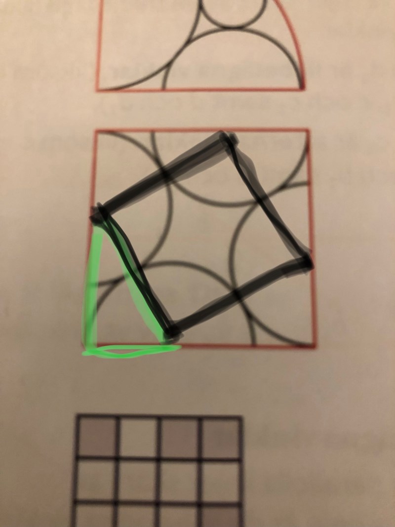 Skulle det gå att lösa:  genom att man veta radien så blir kvadratens sida radie + radie = 4 och med hjälp av pythagoras sats kunna räkna ut? Men problemet jag får då är att hur ska man dela in katerna eftersom de inte är lika långa. Eller finns det något smidigare?