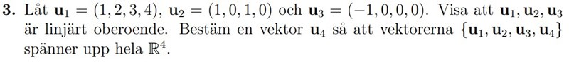 I den andra deluppgiften ska man bestämma en vektor som tillsammans med de 3 övriga vektorerna spänner upp R^4. I facit står det att enbart (0,0,0,1) är en lösning men eftersom det är en kvadratisk matris borde inte alla vektorer som uppfyller att matrisen blir linjärt oberoende vara en lösning? Att spänna upp är ekvivalent med att vara linjärt oberoende för n x n matriser. Så typ (0,1,0,0) är väl också en lösning?